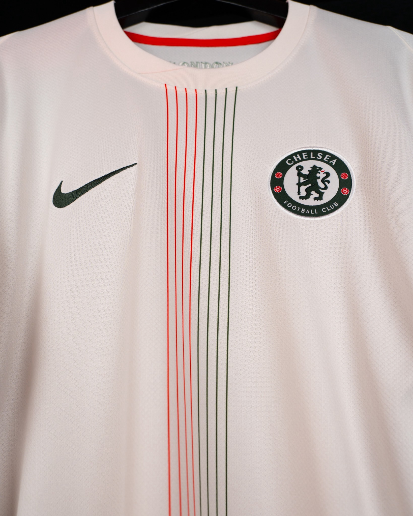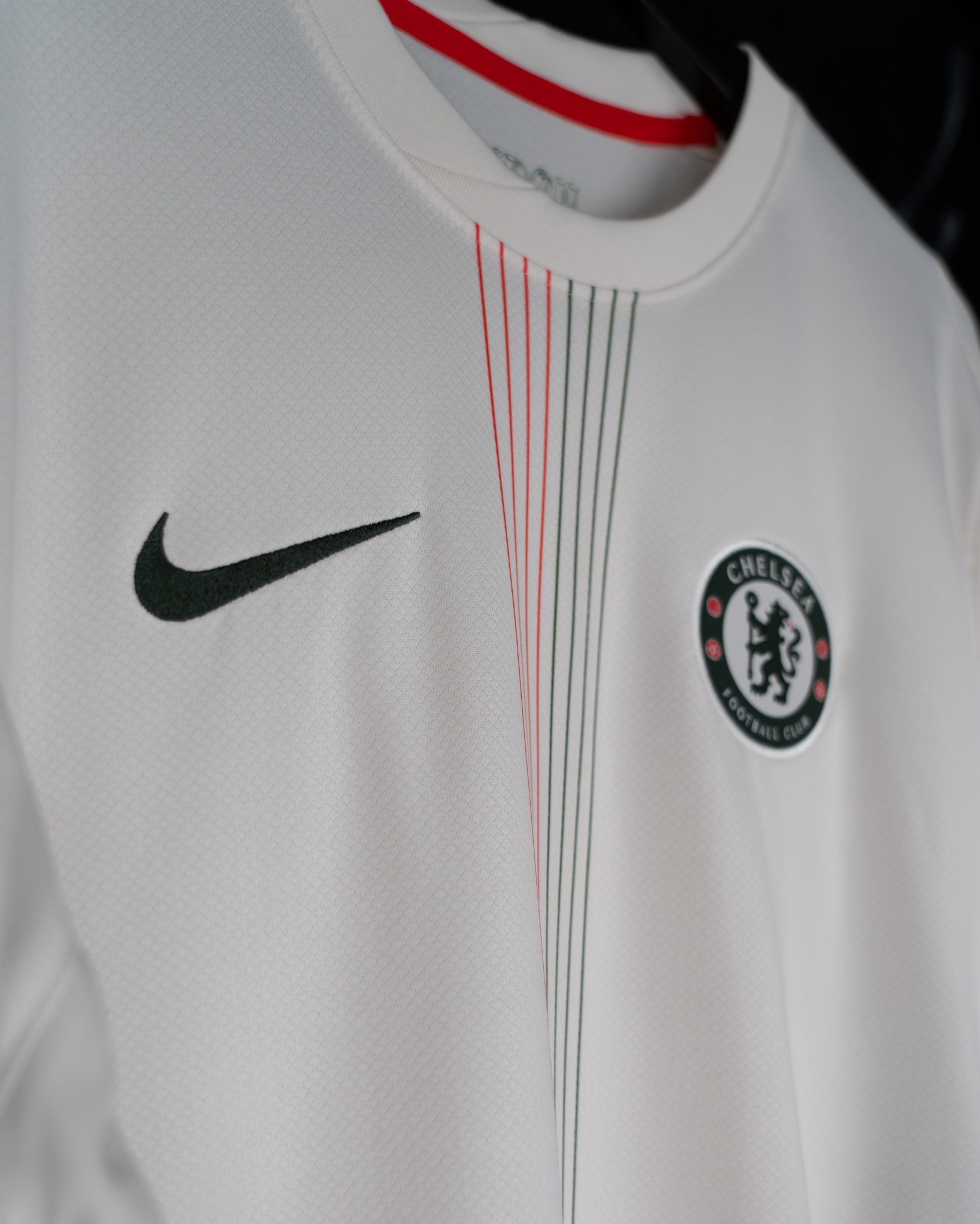 Bold. Minimal. Iconic. The Chelsea FC 2025/26 Away Jersey redefines classic elegance with a sharp, modern edge. Dressed in a clean white base, the design features subtle vertical pinstripes in red and black, flowing down the front in a striking gradient—an homage to Chelsea’s timeless style blended with the energy of London’s streets.