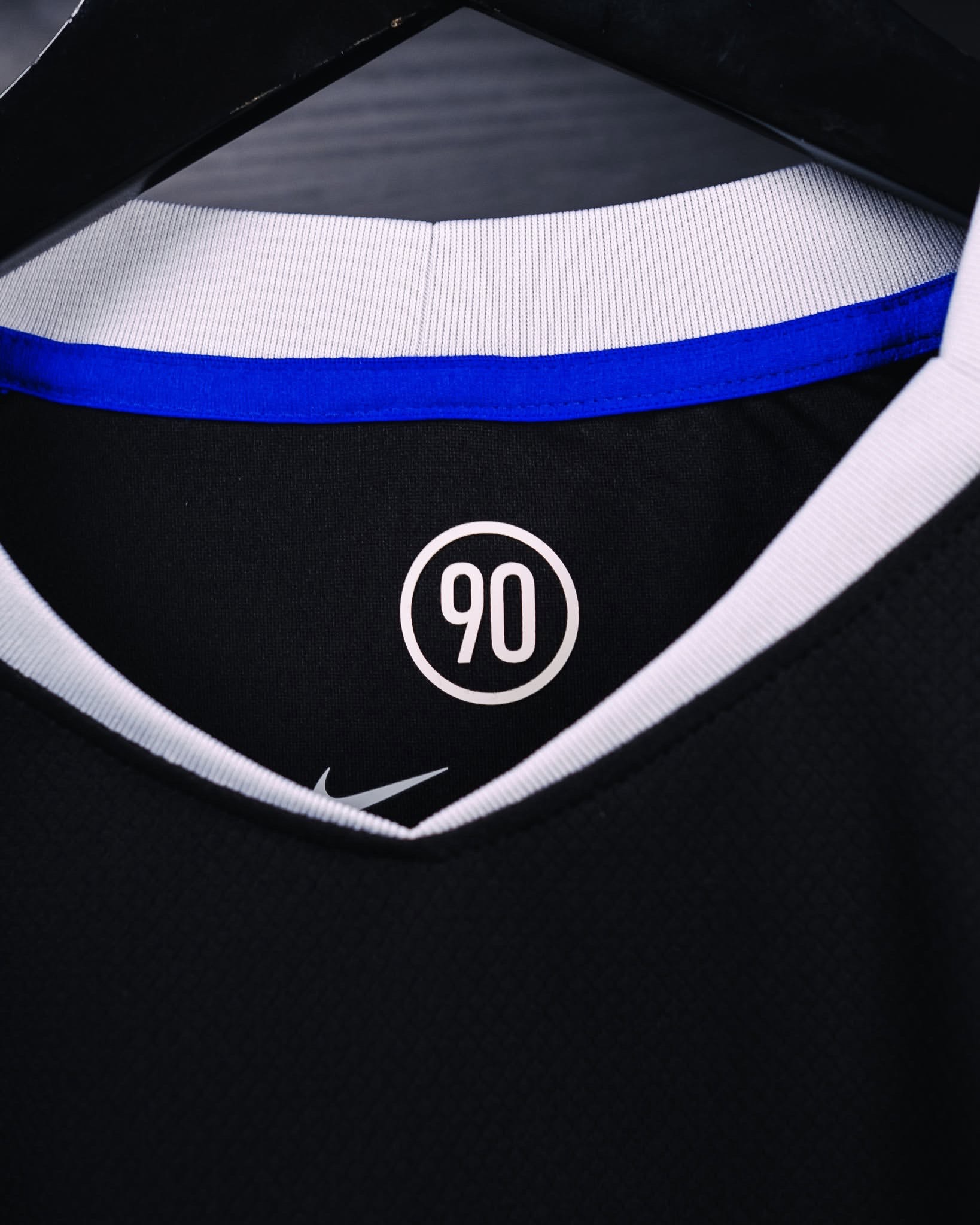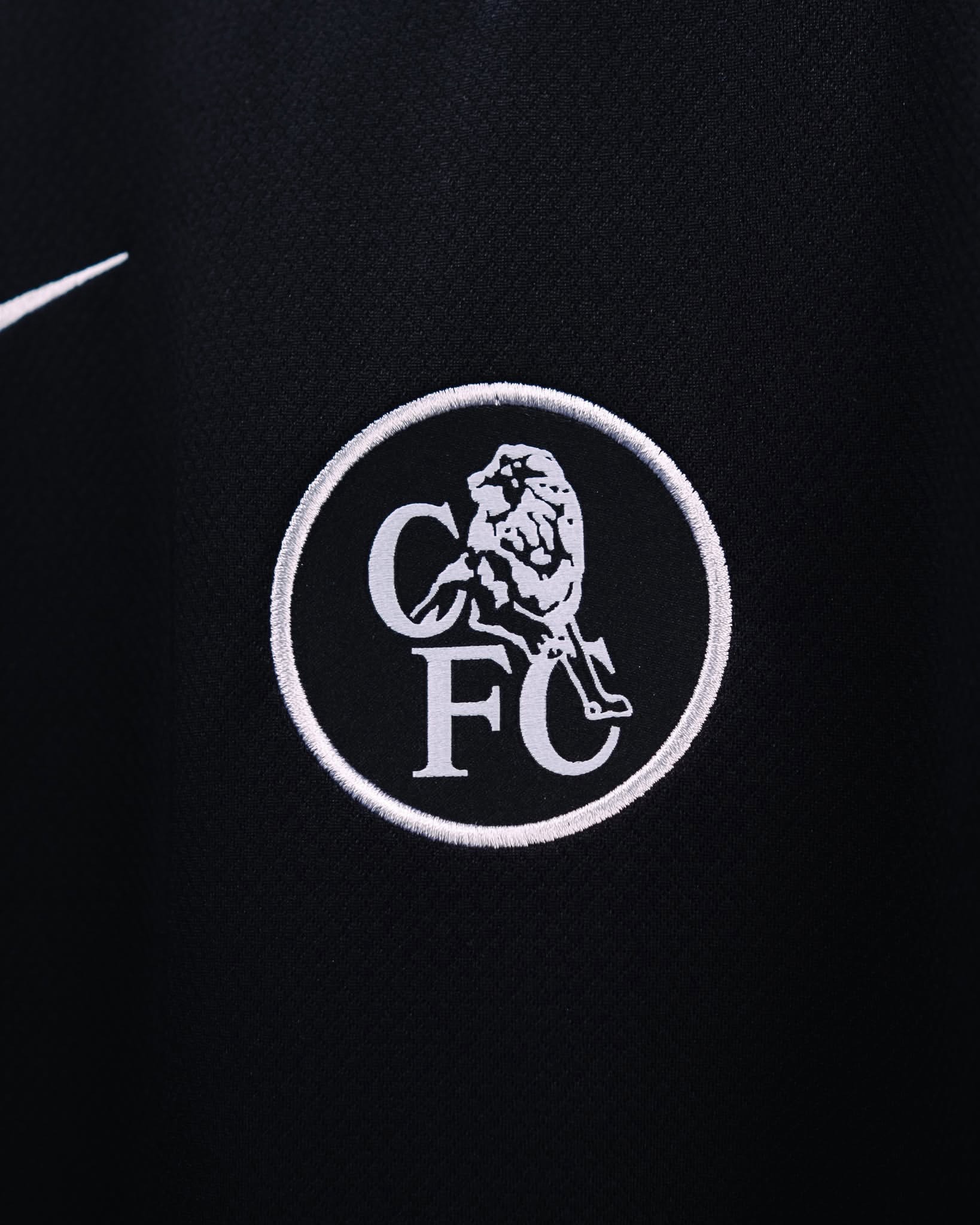 Elevate your matchday style with the Chelsea FC 2025/26 Third Jersey in sleek black, a bold tribute to the club’s storied past and unstoppable future. Crafted by Nike, this jersey revives the iconic Total 90 template from the mid-2000s, channeling the raw energy of Chelsea’s golden era under Jose Mourinho. The predominantly black base delivers a modern, understated sophistication, accented by shimmering Field Silver logos and vibrant Game Royal blue detailing that nods to the club’s enduring spirit. At its heart is the classic Chelsea crest—reimagined in a retro circular frame, last seen between 1986 and 2005—symbolizing two triumphant dawns two decades apart: the 2004/05 Premier League glory and the fresh ambitions of today’s squad led by stars like Cole Palmer and Pedro Neto.