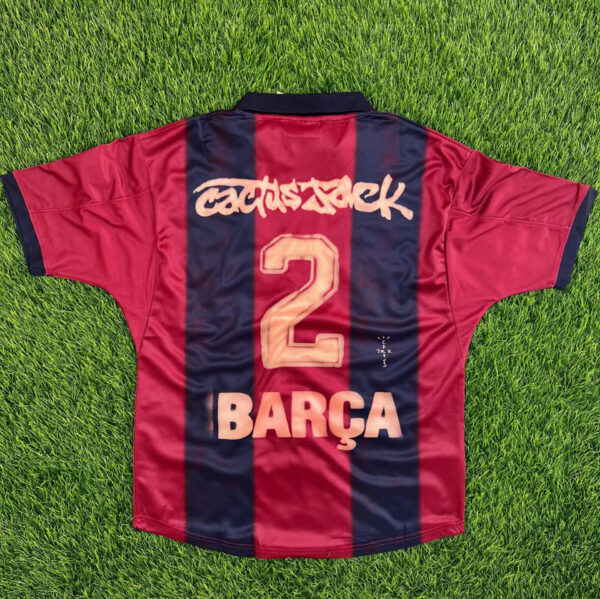 Crafted from premium, breathable fabric, the jersey ensures comfort both on and off the pitch, while the retro-inspired cut pays homage to the club’s legendary past. Unique Travis Scott design elements are seamlessly integrated into the traditional Barcelona colors, making it a standout piece for fans and fashion enthusiasts alike.