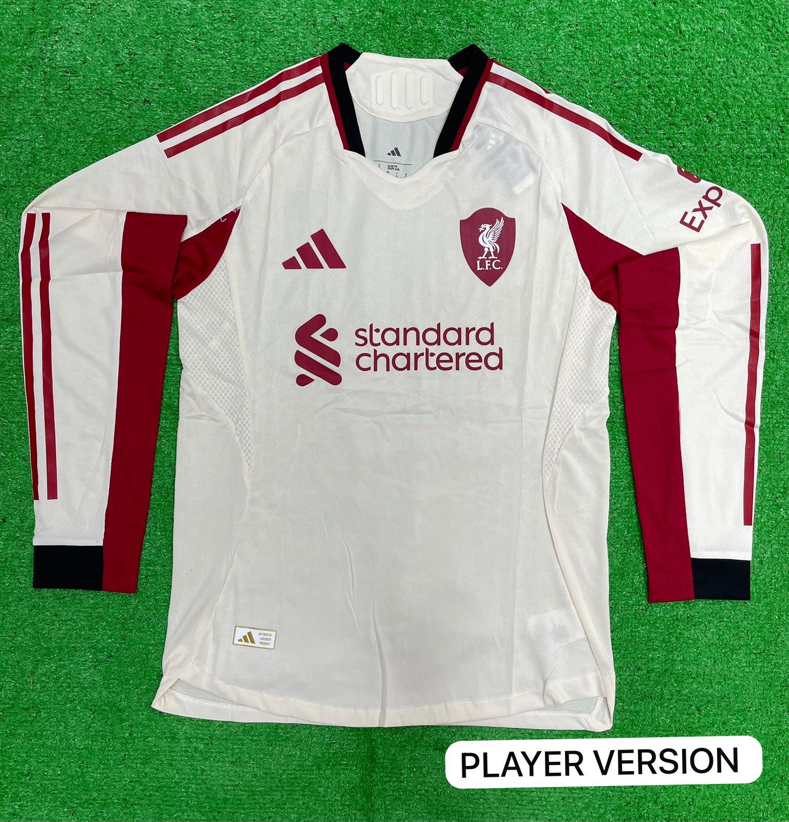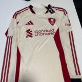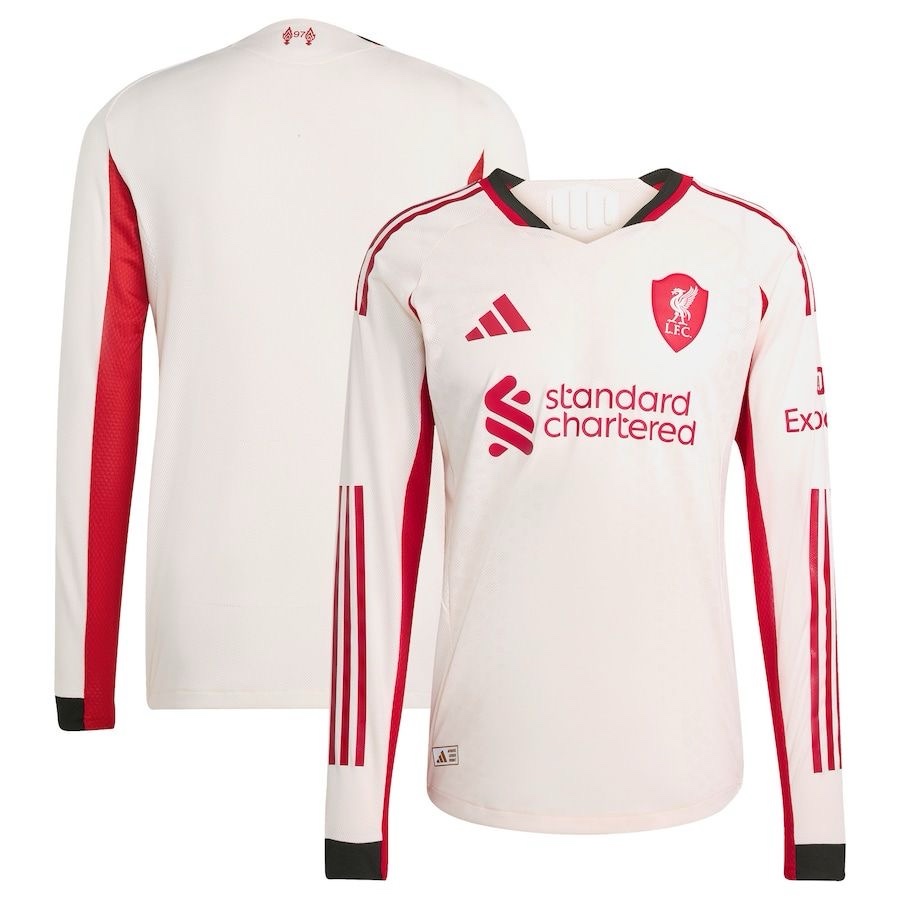 Embark on the road with the Reds in style with the official Liverpool FC adidas 2025/26 Away Full Sleeve Jersey. Marking the triumphant return of adidas as Liverpool’s kit partner after 13 years, this jersey is designed to evoke the spirit of Anfield no matter where the journey takes you. Featuring a clean, modern aesthetic with a “Wonder White” (off-white ecru) base color, it incorporates bold flashes of red and black accents on the sleeves and detailing for an eye-catching contrast that stands out in any crowd. The standout element is the specially crafted Liverpool crest, housed within a sleek shield shape inspired by the iconic arched gable of Anfield’s historic old Main Stand—symbolizing that “everywhere is Anfield” on away days. Ideal for matchdays, training, or casual wear, this full-sleeve version offers extended coverage for cooler conditions while maintaining peak performance features.